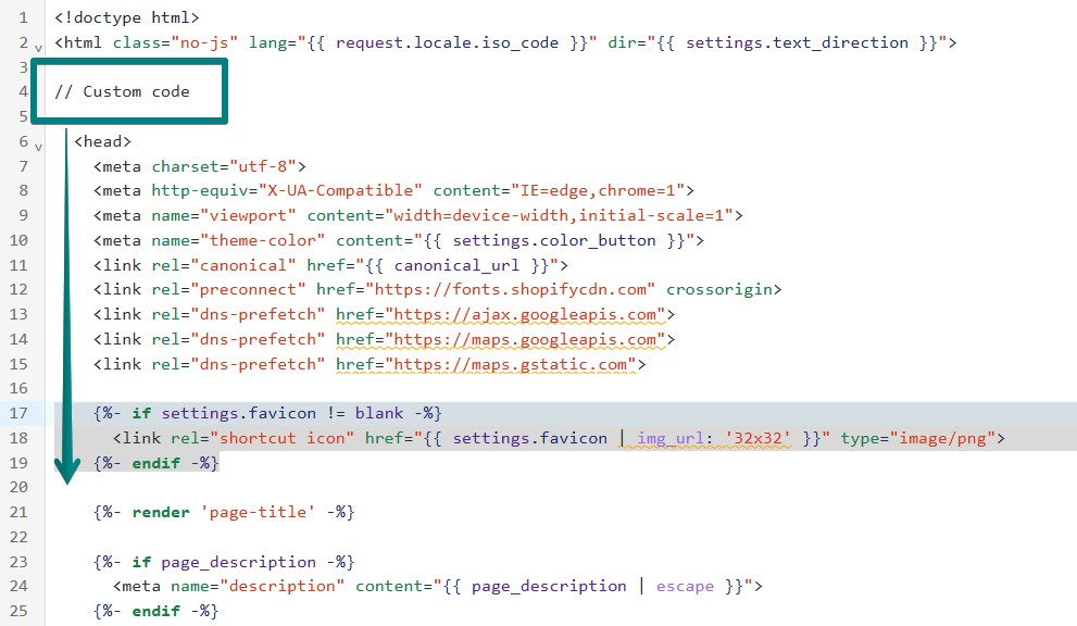 {%- endif -%}To resolve this issue, you should move any custom code that is currently positioned above the favicon code below it: