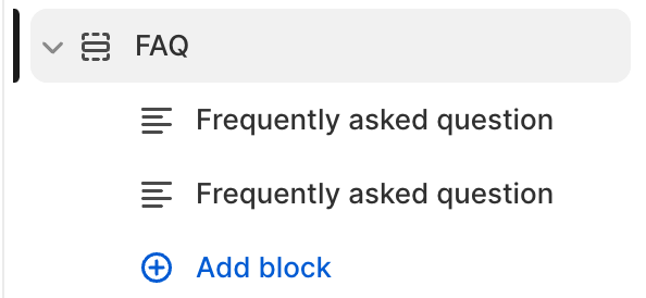 After adding the FAQ section, click on it to access the section options. To add a new FAQ item, click Add block and input both the question and its corresponding answer.