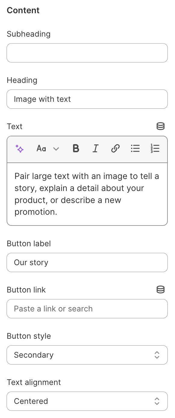 These settings allow you to tailor the appearance and content of the Image with text section to your specific needs and preferences.
