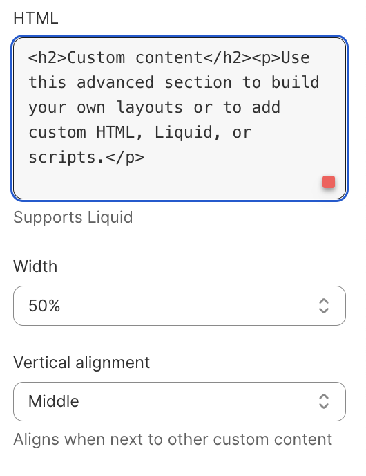 The Custom Content section serves as a blank slate, that allows you to easily include image content and custom code into a page or even the homepage of your shop. This section is a great way to integrate code snippets from 3rd party apps or even extend the theme's existing design with your own unique content.