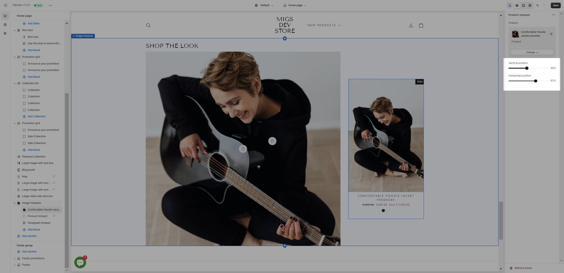 Move the hotspot icons by adjusting the vertical and horizontal positions in the product hotspot block.