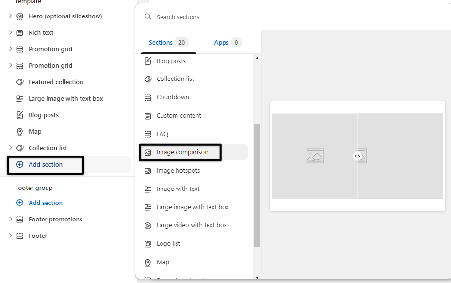 After adding the Image Comparison section, you will be presented with customization options and settings that you can adjust to match your store's style.