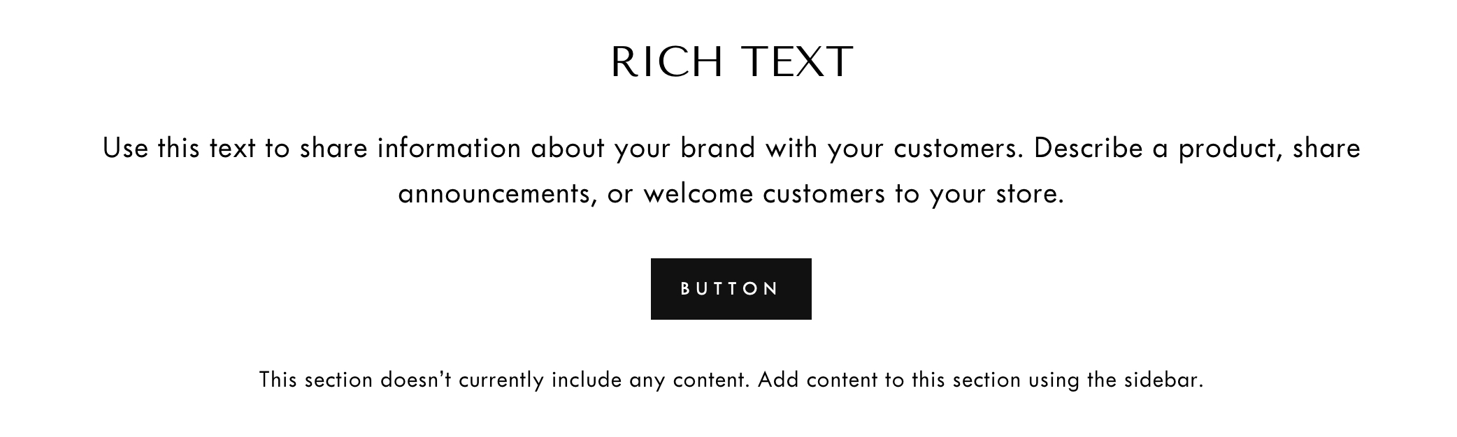 The Rich text section is designed to display text in a full-width block. It's primarily used to get messages across in a clear, simple, and direct manner. It's a great way to introduce your store to visitors, describe your products or services, and make announcements.