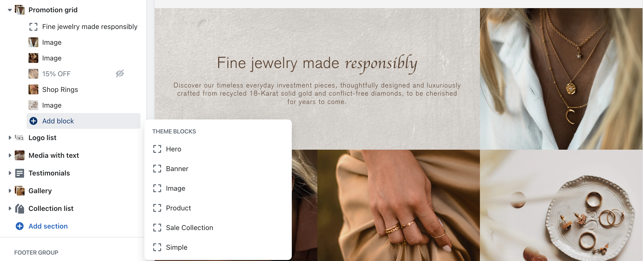 The Promotion grid section offers 6 unique options to implement your media, text and links to products and collection in a flexible grid format.