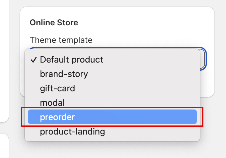 Navigate to the product you want to enable for pre-order and change the template setting to "preorder."