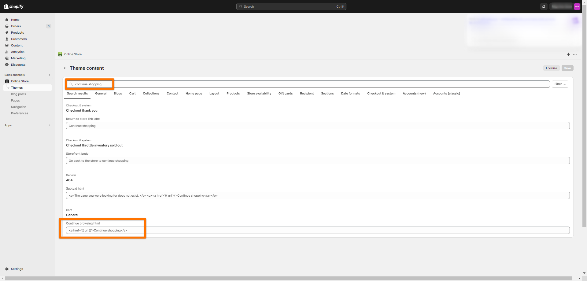Firstly, go to your Shopify admin page and navigate to Online Store > Themes > Actions > Edit default theme content. Then, search for the Continue shopping text.