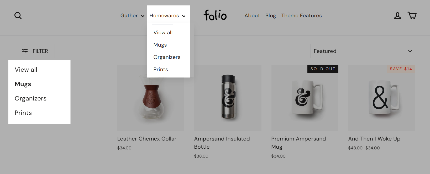 For example, in our demo store, when any collection under Homewares is opened, the related collections are displayed in the sidebar.