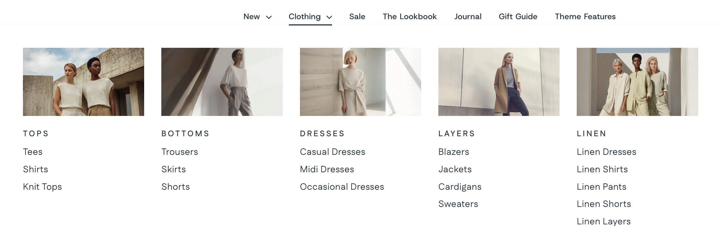 To create a mega menu like the example above, make sure to set up a three-level nested menu. Each third-level navigation item will appear in its own column of links. For example, the Tops column shown above was created using the menu structure below: